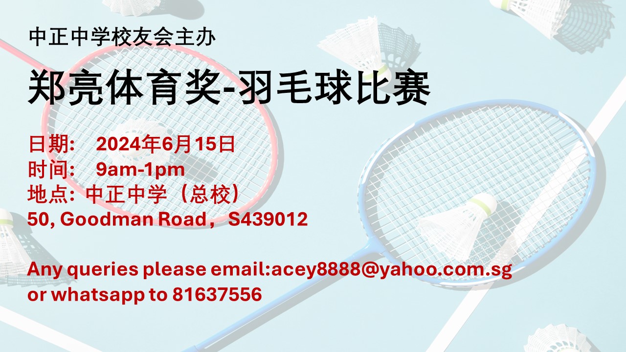 贡献,中正校友会将在2024年6月15日9am-1pm组织郑亮体育奖-羽毛球比赛.