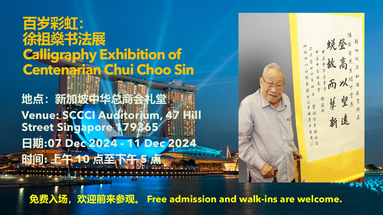 徐祖燊 百岁彩虹 书法展,将展示了约50件近期在新加坡弘扬中华传统文化的作品。 此次活动由新加坡中华总商会、中正中学校友会、南洋孔教会、善济医社、众弘善堂联合举办。此次展览显著了徐先生作为中国书法学会前副会长的贡献。自1948年起,他积极参加展览,并将作品捐赠给慈善机构。欢迎各界朋友莅临展会。